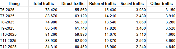 Bảng số liệu thống kê lượt truy cập travelguide.org.vn tính đến thời điểm tháng 12 – 2025 cho thấy nền tảng đã hình thành tệp độc giả ổn định từ sớm. Cụ thể, từ tháng 6 năm 2024, Travel Guide đạt mức trung bình khoảng 40–45 nghìn lượt truy cập/tháng. So với thời điểm hiện tại, lưu lượng truy cập đã tăng gần gấp 2 lần, phản ánh sự tăng trưởng bền vững cả về nội dung lẫn mức độ nhận diện thương hiệu.