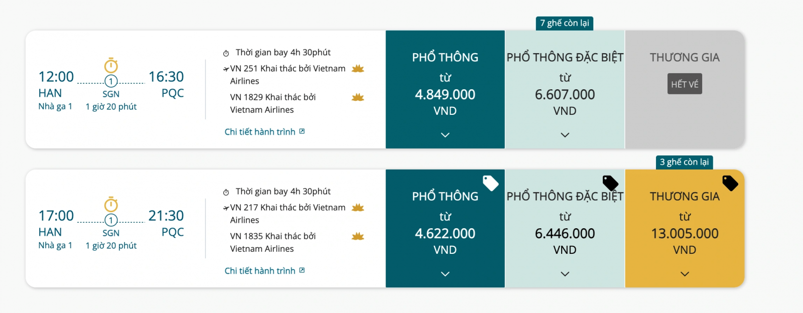 Ở chiều ngược lại, chặng Hà Nội - Phú Quốc ghi nhận mức giá dao động từ 4,8 đến 6,6 triệu đồng/chiều, riêng hạng thương gia lên tới khoảng 13 triệu đồng/chiều. So với một tuần trước đó, giá vé đã tăng hơn 1 triệu đồng, đặc biệt ở các hạng cao.