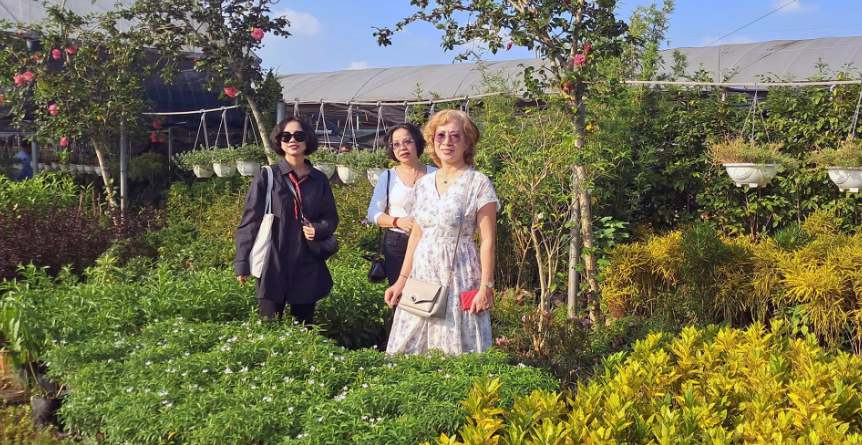 Khách du lịch tham quan vườn cây cảnh tại xã Phúc Thọ. Ảnh: Hoài Nam